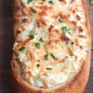 This hot artichoke stuffed bread dip recipe in delicious crusty baguette makes a great, easy party appetizer! YUM!