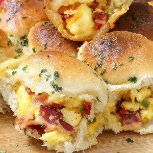Bacon, eggs, and cheese are all stuffed inside a loaf of bread. It doesn’t get much better than this!