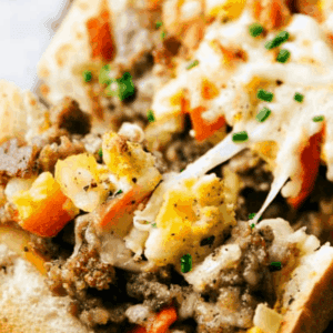 Stuffed with sausage, cheese, eggs, bell peppers, and onions this is guaranteed to be a breakfast the entire family will love!!