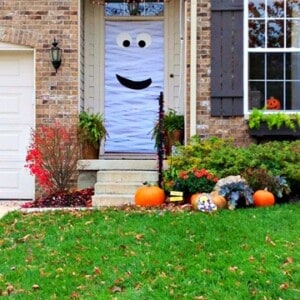 Welcome your guests into your Halloween house right away with a DIY mummy front door. The simple decoration uses crepe and construction paper to come to life.