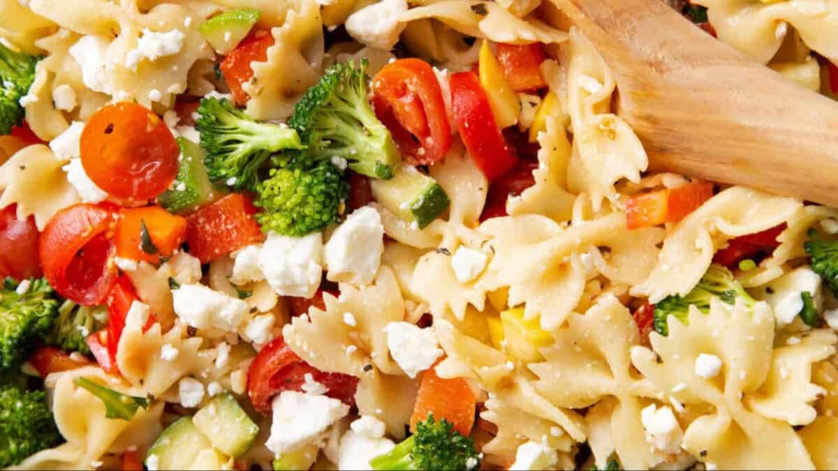 This easy pasta salad features cherry tomatoes, zucchini, broccoli, yellow squash, and red bell pepper. Then, I add freshly chopped basil for a pop of green color and intense flavors.