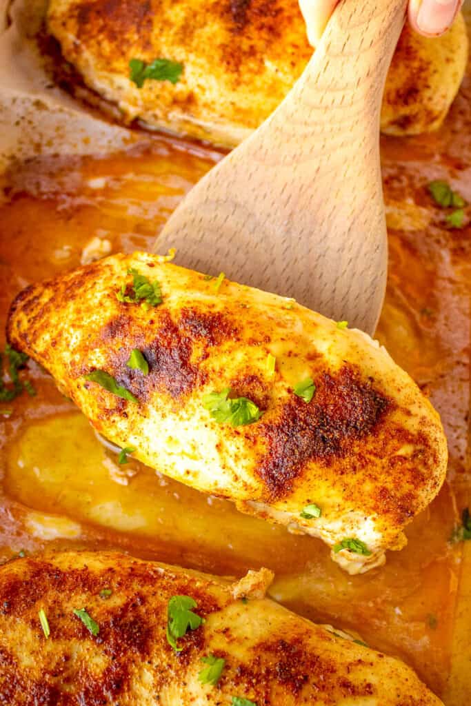 Bake your chicken breasts at 425ºF for a short amount of time and they’ll have that perfectly browned exterior and juicy interior. This works better than cooking at a lower temperature for a longer time, which runs the risk of making your chicken dry and tough. My other recommendation is to use a meat thermometer so you can pull your chicken out of the oven when it hits 165ºF and avoid over-cooking it.