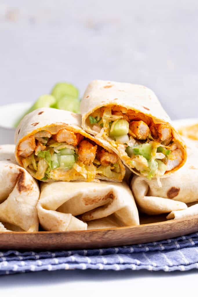 Buffalo chicken wraps are spicy in the best way possible. Spicy buffalo chicken is paired with veggies and cheddar cheese and wrapped in a flour tortilla to create a mouthwatering flavor bomb.