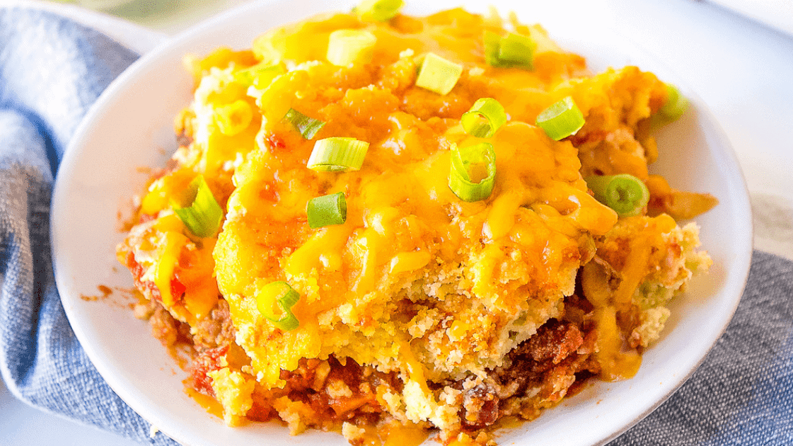This chili cornbread casserole is a hearty dinner your family will love! Homemade chili is topped with a sweet cornbread crust and cheese, and it all comes together in under an hour.