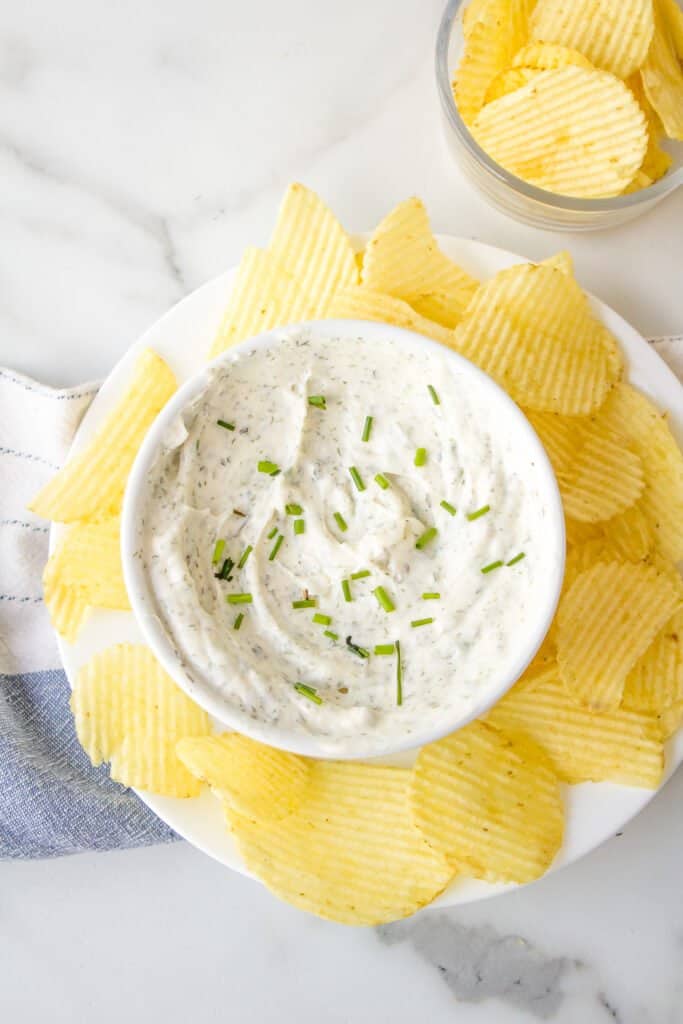 Chip dip is a party staple! Consider this your classic pairing for potato chips—a garlicky, oniony creamy dip flavored with a variety of herbs. Best of all, it’s super easy to make for all those last-minute get-togethers!