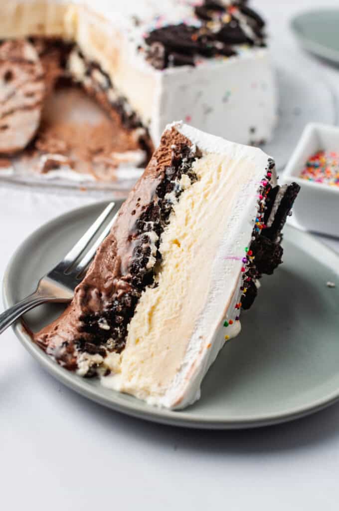 slice of copycat dairy queen ice cream cake serve on a grey round plate