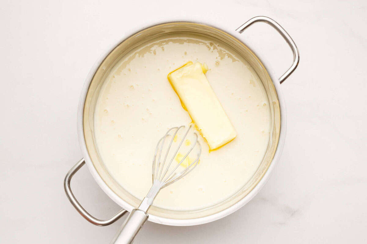 2. Combine with milk: Pour the melted butter into a measuring cup and slowly add the whole milk while stirring.