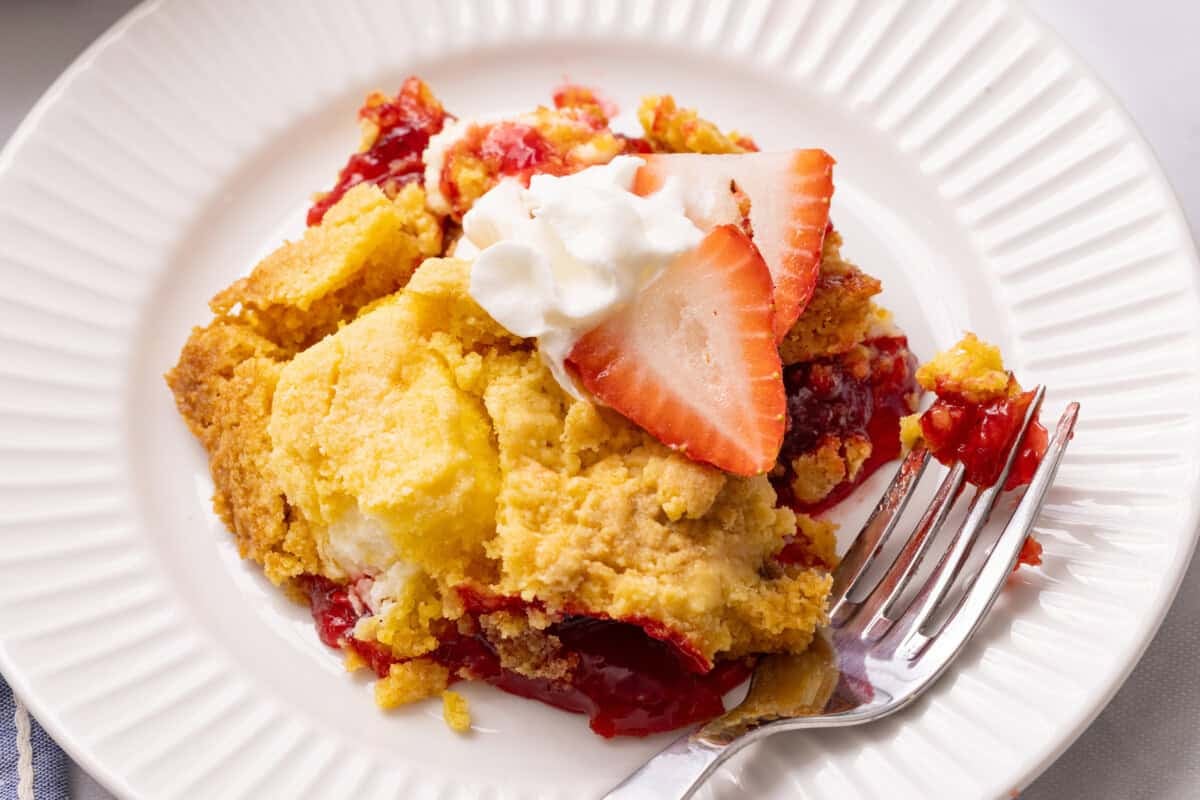 Strawberry Dump Cake is made with only need 3 ingredients – yellow cake mix, strawberry pie filling, and butter for an easy, delicious dessert!