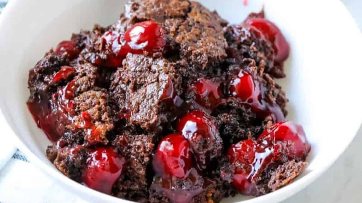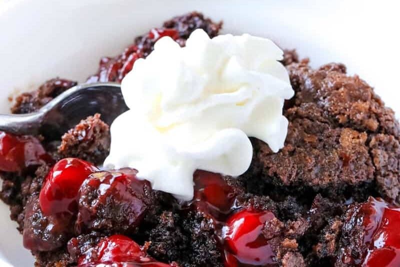 Chocolate Cherry Dump Cake is cherry pie filling is topped with devil’s food cake mix and butter for a sweet treat that’s one part cake, one part cobbler, and two parts irresistible.