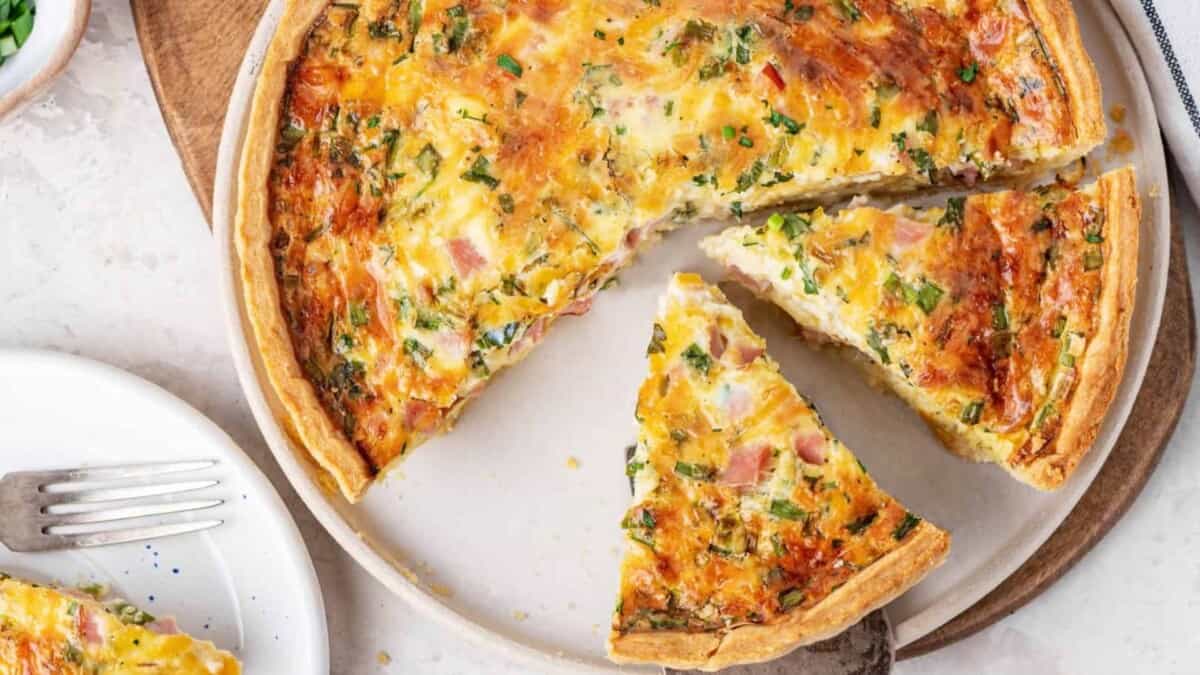 slice cut from ham and cheese quiche