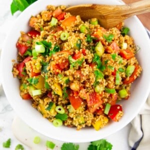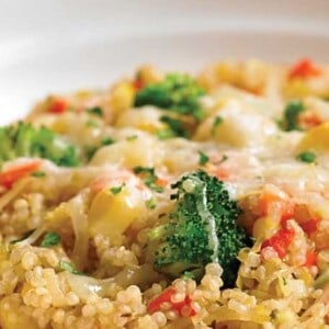 Full of fresh veggies, this quinoa in incredibly flavorful thanks to the use of vegetable broth. It is hearty enough to be a complete meal and also perfect as a side dish with protein sources like broiled chicken!