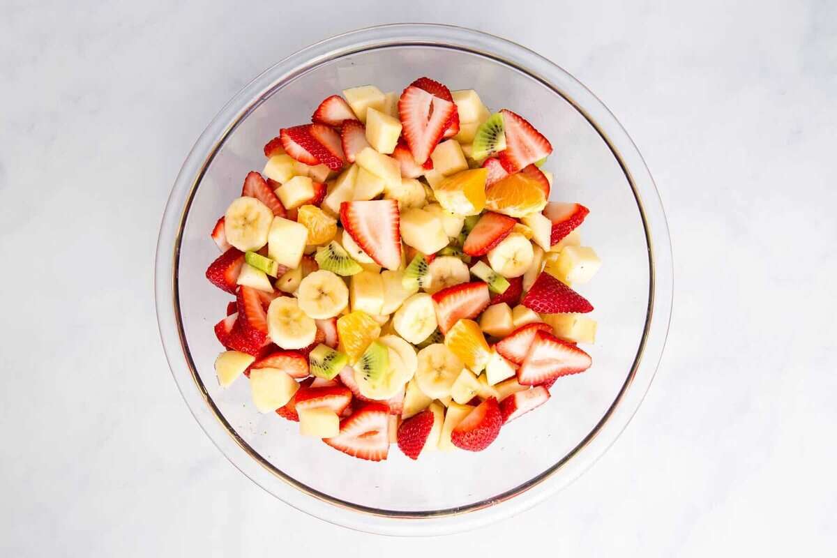 - Cut the fruit: Cut all the fruit into small, bite-sized pieces. I aim for pieces that are one inch by one inch in size.