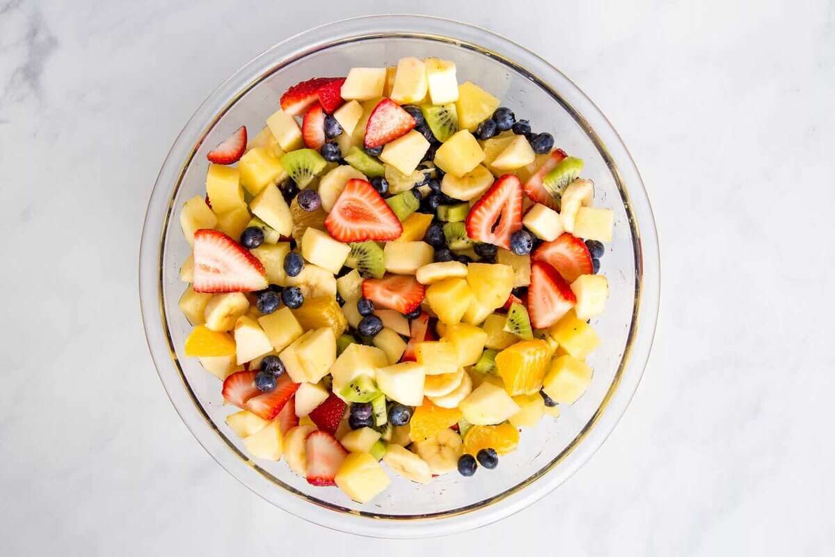 - Mix the salad: Add all the chopped fruit to a large mixing bowl. Then, pour the cold dressing over the fruit. Toss everything together, mixing up the fruit and coating everything in the dressing.