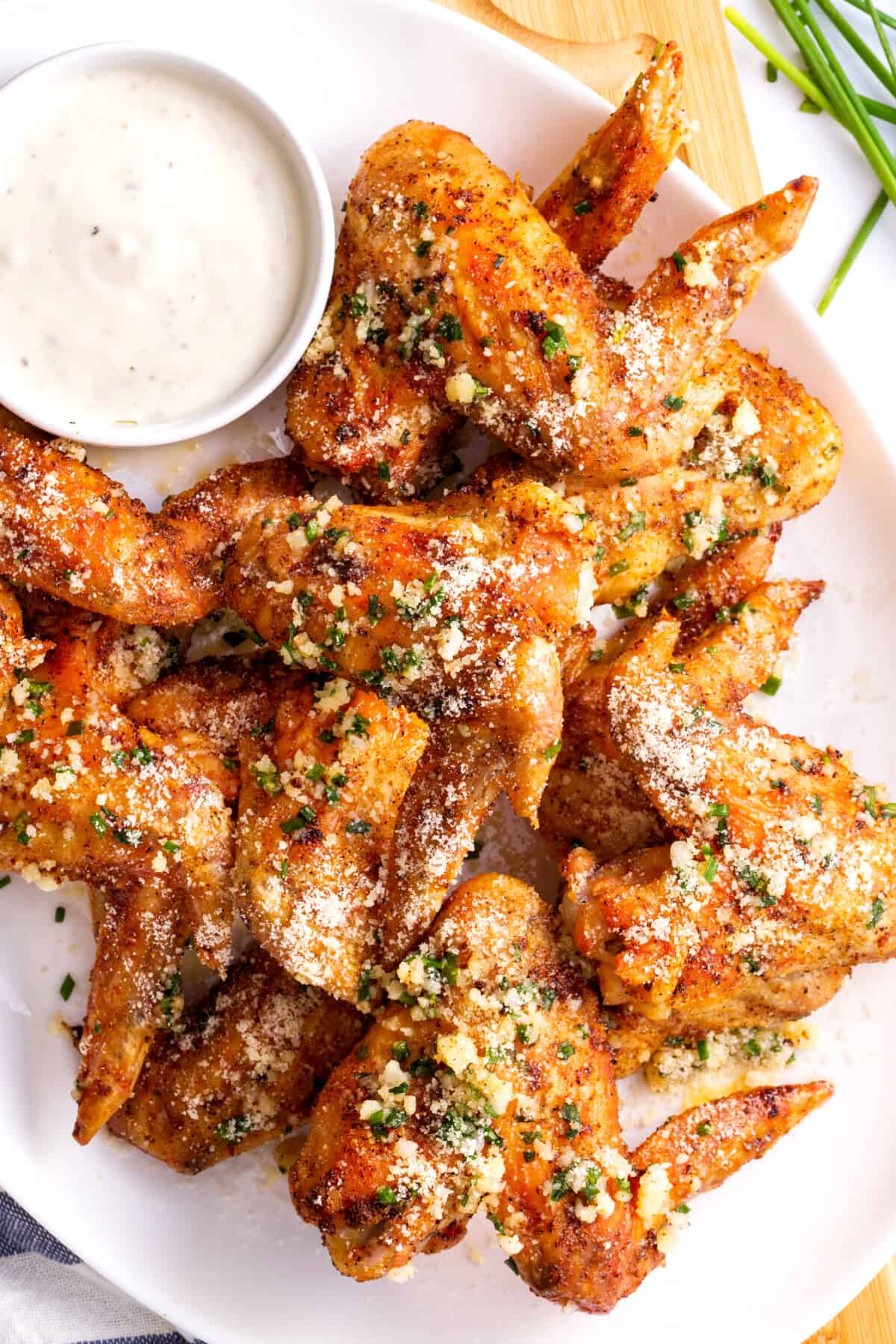 Crispy garlic Parmesan wings made in the oven with buttery garlic sauce and cheese. An easy, family-friendly appetizer everyone loves!