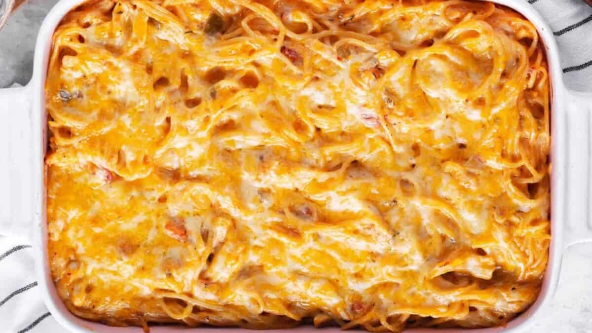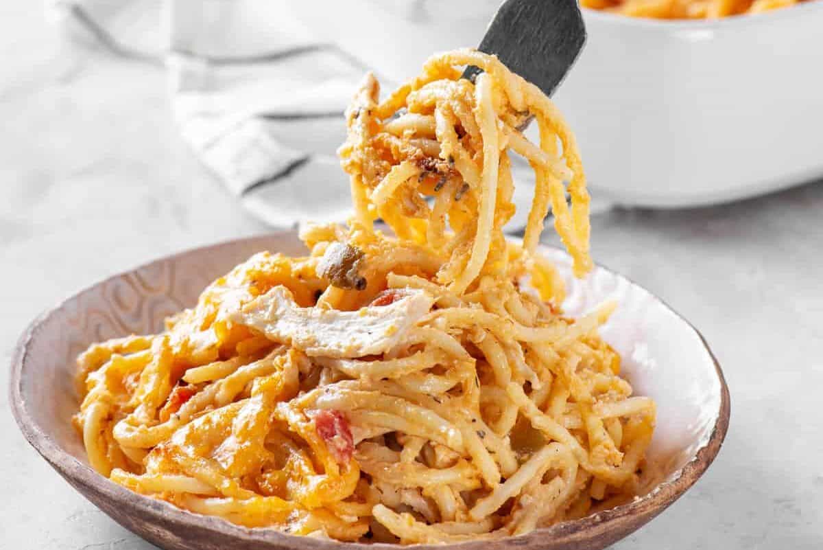 Chicken spaghetti recipe is perfect for a busy weeknight dinner. This is a classic all-time favorite comfort dish the whole family will love. Made with rotisserie chicken or holiday leftovers, this chicken spaghetti casserole recipe will have even the kids asking for more!