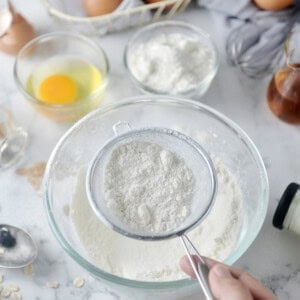 9x13 inch casserole dish with flour, baking powder, baking soda, salt.