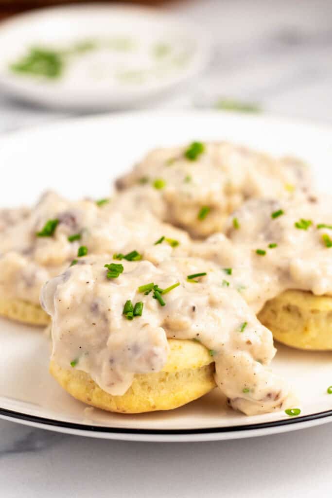 homemade biscuits and gravy served on a plate