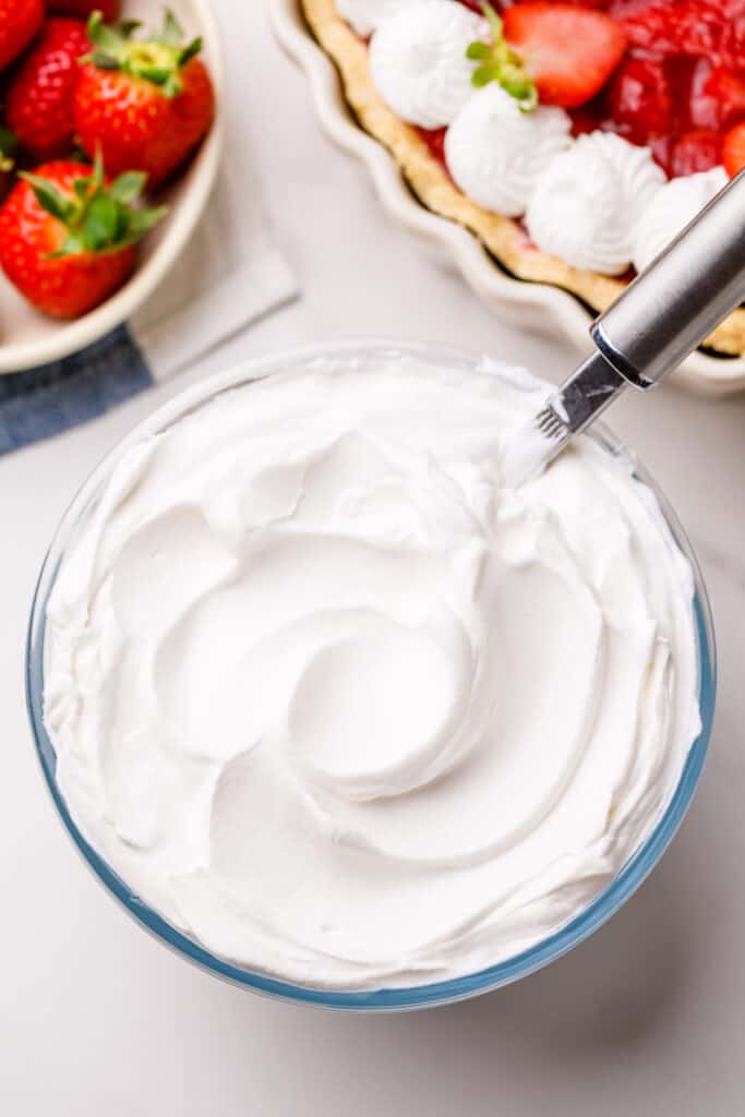 You can use this homemade Chantilly cream as a filling for layer cakes, as a frosting, as a topping for pies and tarts (try it with strawberry pie in the summer or pumpkin pie in the fall!), or pair it with fresh berries for a simple summer dessert. I even use it for topping these Pancake Mix Funnel Cakes!