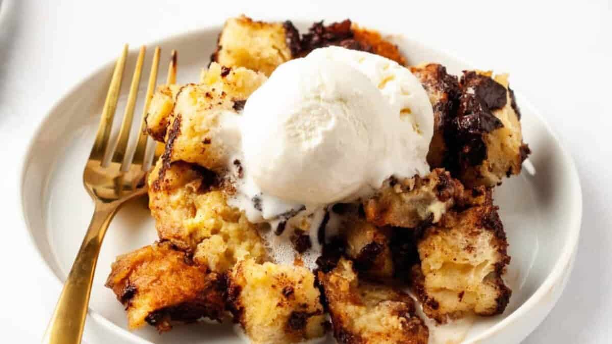 This slow cooker bread pudding is the easiest bread pudding you’ll ever make! It’s full of warm cozy spices and rich, melted chocolate chips—just add a scoop of your favorite vanilla ice cream!