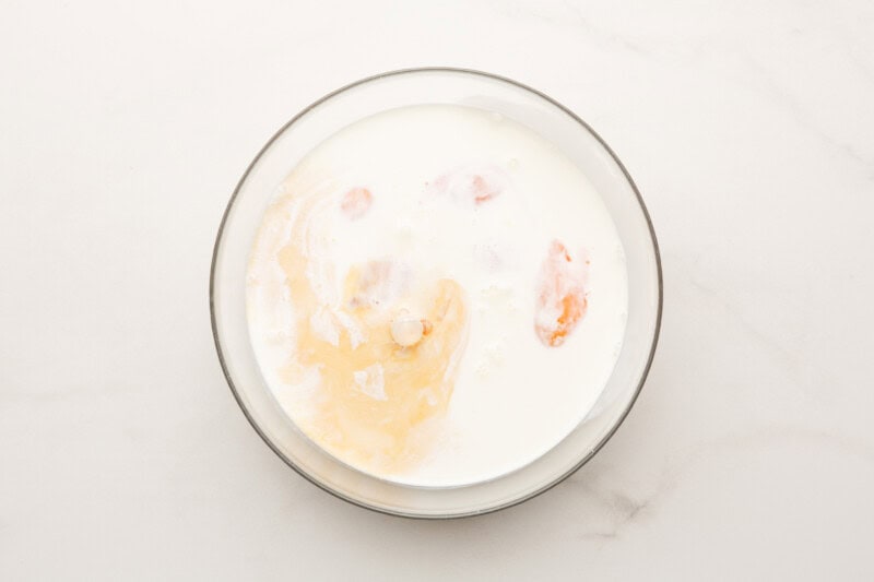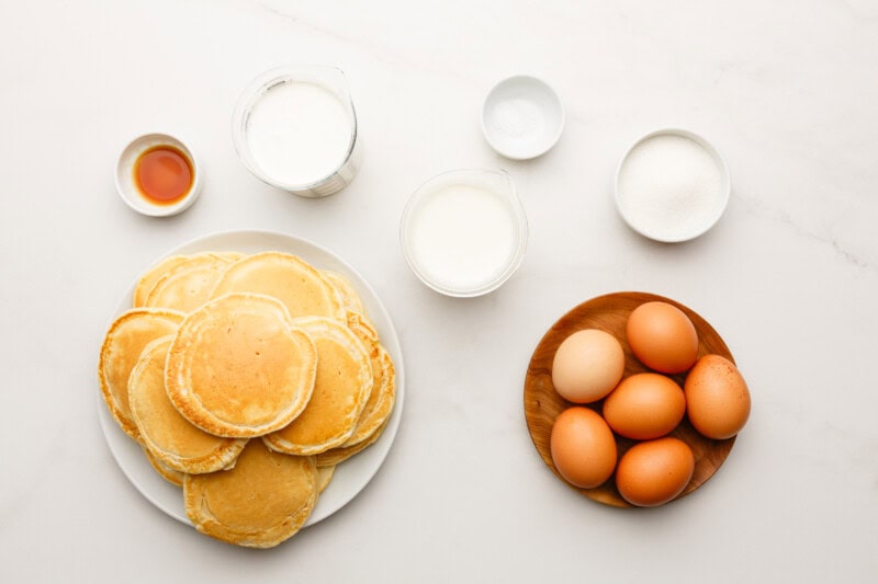 - Whisk together eggs, cream, milk, sugar, vanilla, and salt in a bowl. Slowly pour the mixture over the pancakes.