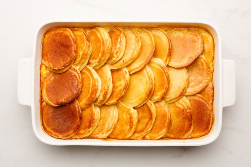 - Arrange pancakes in a baking dish in 3 rows, overlapping slightly.