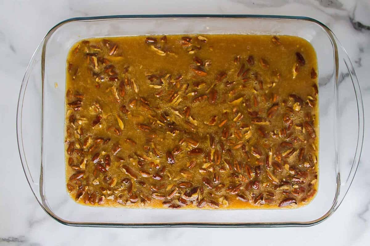 - Bake pecan pie bars for 30-35 minutes, or until the filling is set and a knife inserted an inch from the edge comes out clean.
