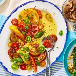 Heirloom tomatoes are at their peak during picnic season, so it’s pretty much a requirement to bring them along in some dishes. This simple salad highlights the tomatoes in the best way possible.