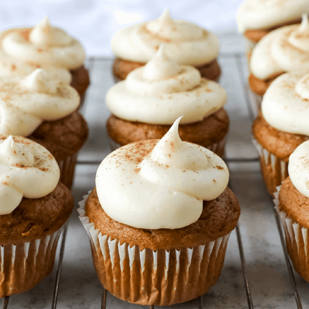 • Frost cupcakes with cream cheese frosting. Optional: sprinkle cupcakes with pumpkin spice.