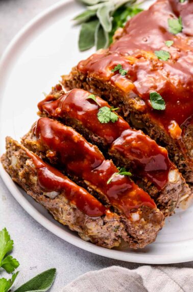 I have been making this southern meatloaf recipe for years. Based on my grandma’s comfort food recipe, it’s a family tradition handed down through generations. It’s also one of my favorite easy meals to whip up on a busy weeknight. All you have to do is mix the ingredients and press the mixture into a loaf pan. Add a side of southern green beans, and we’re good to go!
