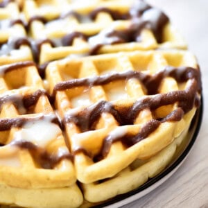 Want to turn your waffles into cinnamon rolls? Well, with this cinnamon roll waffle recipe, it couldn’t be easier. The recipe takes plain homemade waffles and drizzles a cinnamon sugar glaze and cream cheese icing on top to transform them into a cinnamon roll. It’s perfect for when you can’t decide if you should make waffles or cinnamon rolls.