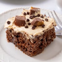 Keyword: chocolate peanut butter poke cake, chocolate peanut butter poke cake with sweetened condensed milk, chocolate poke cake with peanut butter frosting