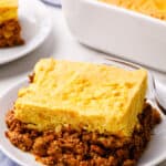 This Sloppy Joe Casserole is a hearty weeknight meal your whole family will love! Ground beef and veggies are simmered with a sweet and tangy sauce, then topped with cornbread and baked to perfection!