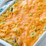 This easy, creamy Turkey Tetrazzini recipe is a delicious pasta casserole dish that is perfect for using up leftover holiday turkey! Cooked turkey is combined with cream of mushroom soup, cream of chicken soup, sour cream, green peppers, and milk and topped with sharp cheddar cheese for an easy dinner recipe your entire family will love!